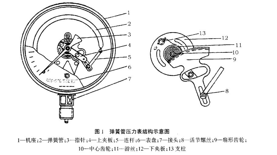 彈簧管壓力表的結構及工作原理如圖1所 示。彈簧管2與接頭7相通,當壓力從接頭7引人彈簧管后,彈簧管的截面積由橢圓趨向圓形變 化,同時彈簧管彎度變小,管子略為伸直,自由端 產生位移。此位移通過由拉桿5、扇形齒輪9和 中心齒輪10組成的傳動機構轉變成中心齒輪軸 的轉動,帶動裝在齒輪軸t指針3轉動,于是可以 從表盤6上讀出壓力值。中心齒輪10下端裝有 游絲11,游絲一頭固定在中心齒輪軸上,另一頭 固定在上下兩夾板4和12間支柱13處,游絲的 作用是消除中心齒輪與扇形齒輪嚙合時的間隙和 被測壓力消除后使指針回到零位。