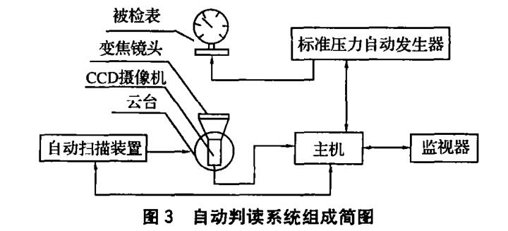 指針式壓力表自動判讀系統如圖3所示。CCD 攝像機由自動掃描裝置控制經云臺帶動,完成對被檢 表的瞄準及攝像。監視器用以實時顯示被檢表及圖像 處理過程,而表盤圖像的數據處理由主機完成。