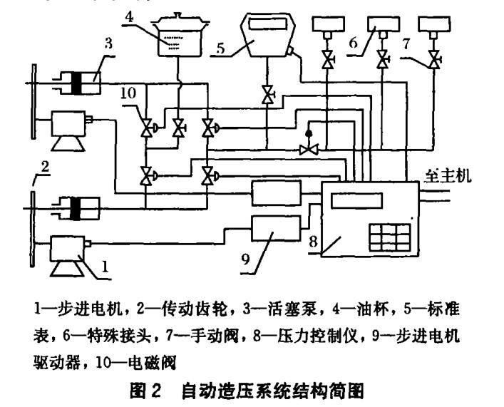 標準壓力自動產生系統為閉環油壓系統,系統配 置如圖2所示。采用步進電機帶動活塞壓力泵作為執行機構,利用0. 05級精密數字壓力表作為標準表測量 系統壓力,并利用單片機壓力控制儀對造壓過程進行 閉環負反饋控制。