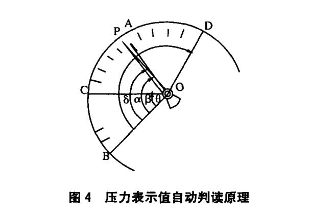 表盤圖像處理主要包括圖像預處理、表盤圓心的 確定、刻線及指針的判讀。預處理包括圖像灰度分割、 圖像腐蝕與膨脹,以獲得黑白分明的二值圖像并去除 噪聲。為提高搜尋速度實現實時處理,表盤圓心只在 一定范圍內尋找。以確定圓心橫坐標為例,分別從左 及從右讀取某一行像素點的灰度值,兩次掃描所遇第 一個灰度小于域值的像素點(即黑點)列數的均值,即 為該行上圓心橫坐標。依次掃描圖像中部100行,取 100個平均值中概率最大的值作為圓心橫坐標。縱坐 標的求取原理相同.粗刻線的判讀采用霍夫變換法。 霍夫變換法是利用圖像處理識別直線段的有效方法之 一。它將圖像空間中的一點變換為參數空間中的一條 直線。圖像空間中同一直線上的點,經霍夫變換所形 成的直線交于參數空間中的一點,該點坐標代表圖像 空間中直線的斜率及截距。利用累加數組累計參數空 間中通過該點的直線條數,即代表圖像空間中直線上 的點數。采用這種方法計算表盤圖像中某一線段上灰 度小于域值的像素點個數,即可判斷該線段是否處于 粗刻線上。為提高判讀效率,只在表盤圖像的一定范 圍內搜尋粗刻線。指針的判讀方法原理相同,只是搜 尋的范圍略有不同。示值計算方法如圖4所示。以刻 度盤圓心(指針轉軸)為極點,儀表下限刻度OB為極 軸,按順時針方向建立極坐標系。利用表盤粗刻線及 指針對應極角的大小,確定指針所指示的壓力值。假 定指定檢定點及相鄰的前后檢定點分別為A、C、D,指 針中心線矢徑為OP,它們的極角為a、e林對應壓力 值分別為a、c、厶/>,則儀表指針的示值由下式計算。 p = a + (j3—a) * (d — a')/(S — a) (a </?) (1) p = a — ia~0) * (.a — c)/(.a — d) (a >/9) (2)