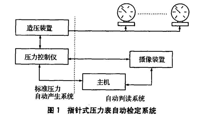 自動檢定系統由標準壓力自動產生系統及自動判 讀系統兩部分組成,如圖1所示。被檢壓力表通過特 殊接頭固定在檢驗臺上(最多可達6塊)。由標準壓力 自動產生系統產生指定檢定點的標準壓力,其壓力控 制指令由主機根據鍵盤輸人參數傳遞。當系統中壓力 穩定后,通知攝像裝置依次攝取檢驗臺上的表盤圖像, 并傳送給主機。主機中配有VIGP 2M圖像處理卡及 圖像處理軟件,可實時處理表盤圖像,并依次計算各儀 表指針示值及其在該檢定點的誤差。依次進行正反行 程的檢定,最后打印檢定結果。