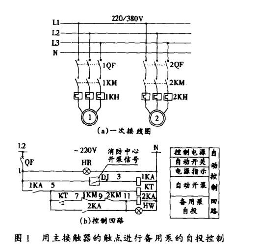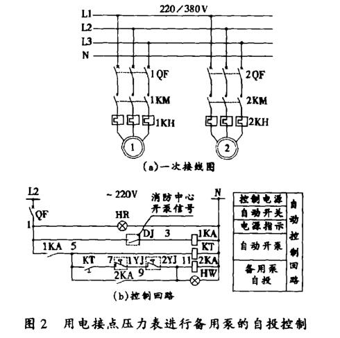 在電氣工程設計中,常遇到消防泵(包括消火 栓泵、噴淋泵、卷簾泵的電氣控制問題。一般情 況下消防泵為兩臺,一臺工作一臺備用,在工作泵 出現故障時,備用泵必須盡快自投滿足火災時對 消防水的要求,以盡快撲滅火災,把損失降到最 低。設計中包括各手冊及標準圖),備用泵的自投 多采用在控制回路中接人主接觸器的常閉觸點來實 現。筆者最近在幾個工程的設計中,采用電接點壓 力表對備用泵進行自投控制,經過調試、驗收,反 應良好。下面以全壓啟動消防泵為例,對兩種方案 進行比較,僅供讀者參考。