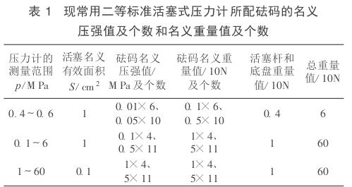 我們現在生產的活塞式壓力計的砝碼總重量,是 做到了最小極限,也就是測量上限用多少重量的砝碼, 就用總重量(包括活塞桿和承重底盤)是多少的砝碼^ 表面上看砝碼總重量做到了最少,似乎檢表時可以少用1 ~ 60MPa的二等標準活塞式壓力計,檢普通壓力表和精密壓力表時的砝碼使用情況,與表2和表3完全相同。用0.04 - 0.6MPa的二等標準活塞式壓力計檢精密壓力表 也得倒砝碼。為了節省篇幅不再列舉。