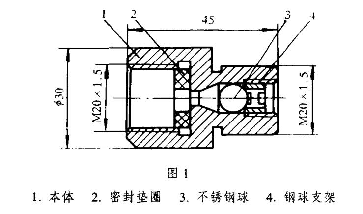 此裝置安裝在被保護件(例如壓力表)與壓力 源之間,裝置的一端用螺紋(M20 x 1. 5)與被保護件 進行聯(lián)接,另一端與壓力源聯(lián)接。正常情況下,當被 保護件無泄漏時,鋼球3上下兩端的壓力相等,鋼 球依靠自重穩(wěn)定在鋼球支架4上,壓力介質則順利 的流經(jīng)鋼球與本體1的縫隙進入被保護件。當被保 護件發(fā)生泄漏時,鋼球上下兩端產(chǎn)生壓差,鋼球迅 速上浮,嚴密封閉密封口,從而,切斷壓力源,使維 修人員得以有充分的時間關閉閥門,更換已經(jīng)損壞 的被保護件。此裝置適用于氣體、蒸汽和各種低粘 度液體介質的泄漏保護。本裝置應垂直安裝于壓力 源與被保護儀表(或裝置)之間,兩端接口內車制有 M20X1.5的螺紋,供與被聯(lián)接件聯(lián)接。垂直安裝時 的傾斜角不得大于6度。