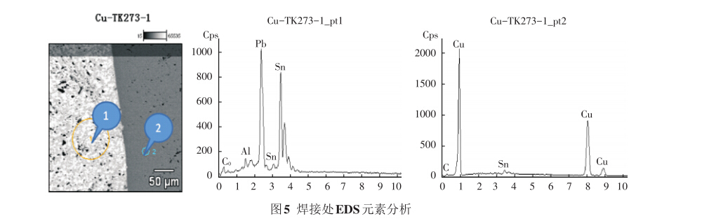 對焊接處進行微區能譜分析,如圖5所示。其 中彈簧管為純銅制造,焊料主要成分為Pb和Sn,有 微量的Al、Co雜質元素。雜質元素明顯會影響焊料 的潤濕性和流動性,加之封口塞的幾何外形容易有 氣隙和裂紋,使焊接點的強度下降。